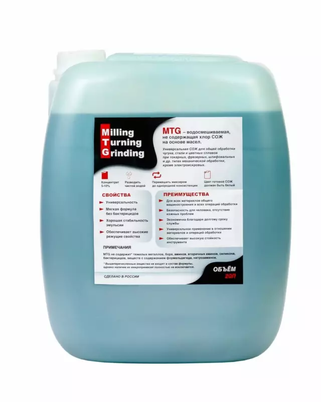 Смазочно-охлаждающая жидкость MTG для любых лезвийных операций даже высоколегированными сталями. СОЖ выполняет высокие требования, как по чистоте обрабатываемых поверхностей, так и по стойкости инструмента.